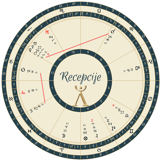 d) Mars na 11° Raka, Venera na bilo kom stepenu Ovna ili Škorpiona – uzajamna recepcija; na stepenu na kome se Mars nalazi, Venera ima dostojanstvo tripliciteta i termina pa će u skladu sa tim moći da ponudi recepciju. S druge strane, Mars nudi recepciju Veneri jer je ona u njegovom sedištu.