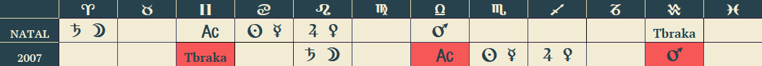 U solarnom horoskopu za 2007/2008. godinu vidimo Saturna (opet) u nepovoljnoj zodijačkoj poziciji (u izgonu u Lavu), kako pritiska ne samo natalnu Veneru nego i solarnu s kojom je u konjunkciji. Kao vladar vremena sa prirodnom vladarkom veza/braka svakako obećava dešavanja na ovom polju, tim pre što je Venera aktivirana i profekcijom koja je te godine stigla u Vagu.