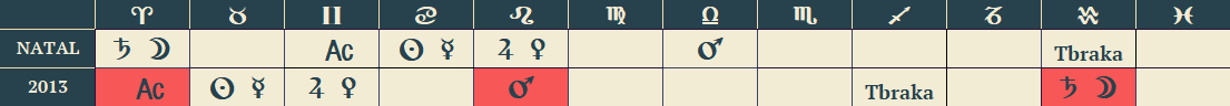 A onda se desila 2013. godina. Nešto ranije ascendent je promenio termin, ušao je u znak Lava i pod upravu Jupitera, tako da je ovaj veliki benefik postao jedan od vladara vremena. I firdarima je bio na snazi Sunce-Jupiter period. Profekcija se zatekla u znaku Ovna, pa su se aktivirale planete u njemu (Saturn i Luna) i Mars kao vladar znaka. Tako za kormilom ponovo imamo benefika zajedno sa maleficima. Solarni povratak je još zanimljiviji.