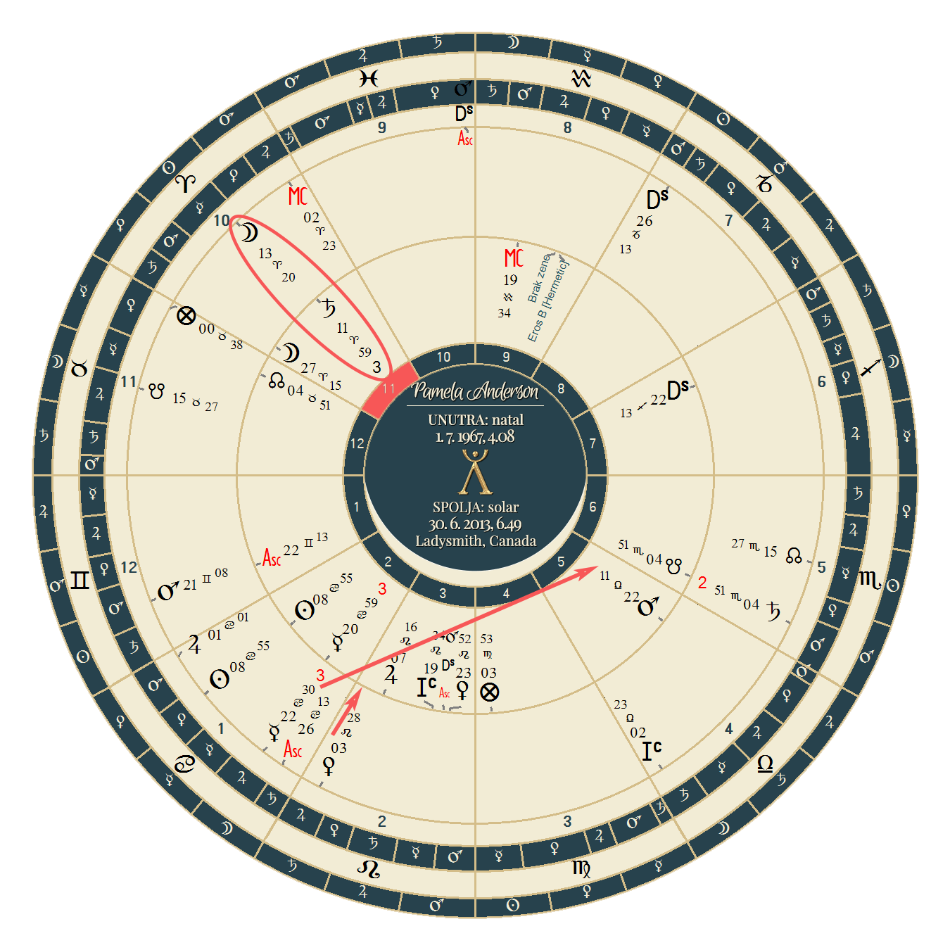 U Vagi se našao i solarni MC (vrlo blizu Marsa), a Venera aspektuje natalni MC na isti način na koji to čini u natalnom horoskopu. S tom razlikom što je sada u konjunkciji sa vladarom tog MC-a.