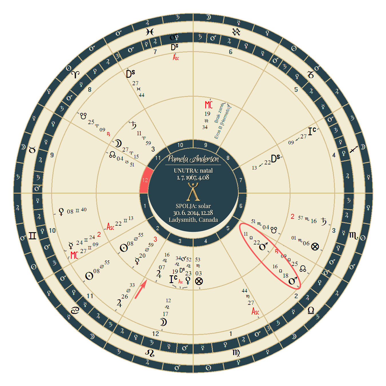 Istovremeno je vrlo aktivan Mars – prirodni vladar sukoba, razdora i razvoda. Aktiviran je profekcijom jer se natalno nalazi u Vagi, a vidimo da mu se u solaru pozicija ne popravlja – opet je u izgonu (znak Bika) u nepovoljnoj kući, a odatle u lošem aspektu prema natalnom vladaru VII kuće Jupiteru. Primećujemo i da su oba malefika na uglovima od tačke braka.