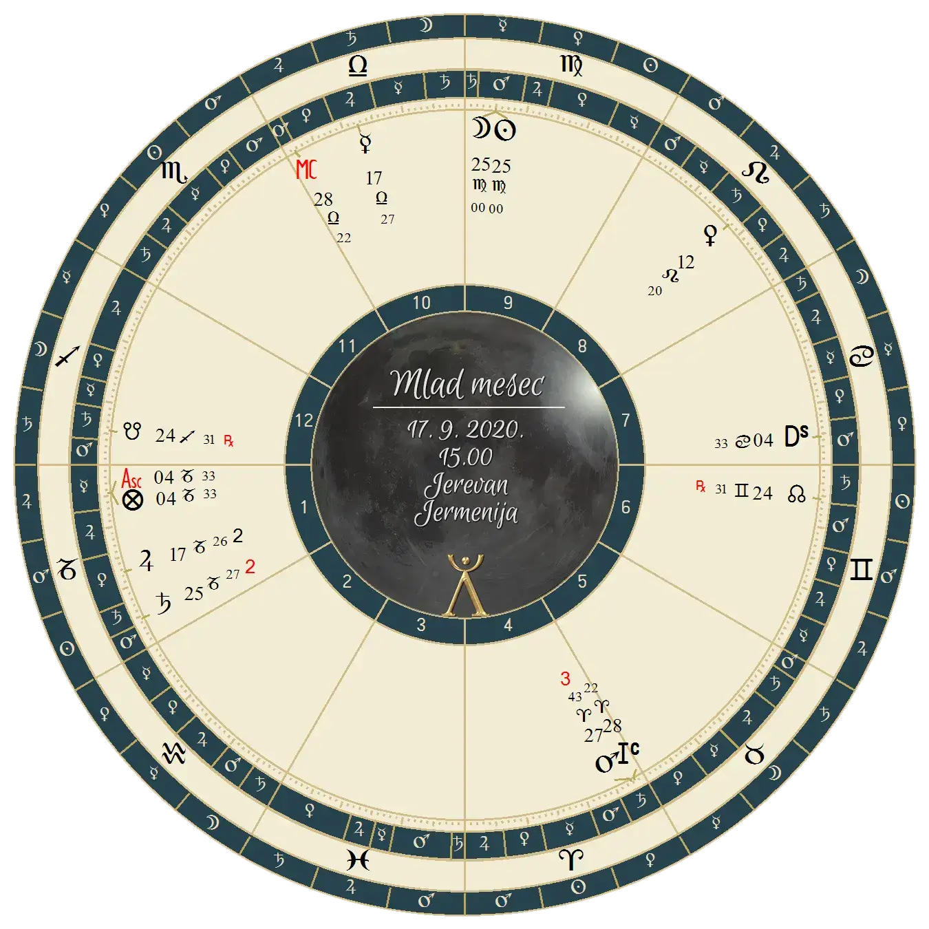 U horoskopu ove konjunkcije vidimo kako Mars jaše na uglu, ovog puta ponovo u IV kući gde je u konjunkciji sa IC-om. ascendent je u Jarcu, a Saturn u prvom polju u aplikacionom kvadratu sa Marsom. Sunce i Luna su se sreli u terminu Marsa u Devici, što znači da je Mars vladar ove konjunkcije. Dakle, opet planeta sukoba u žiži!