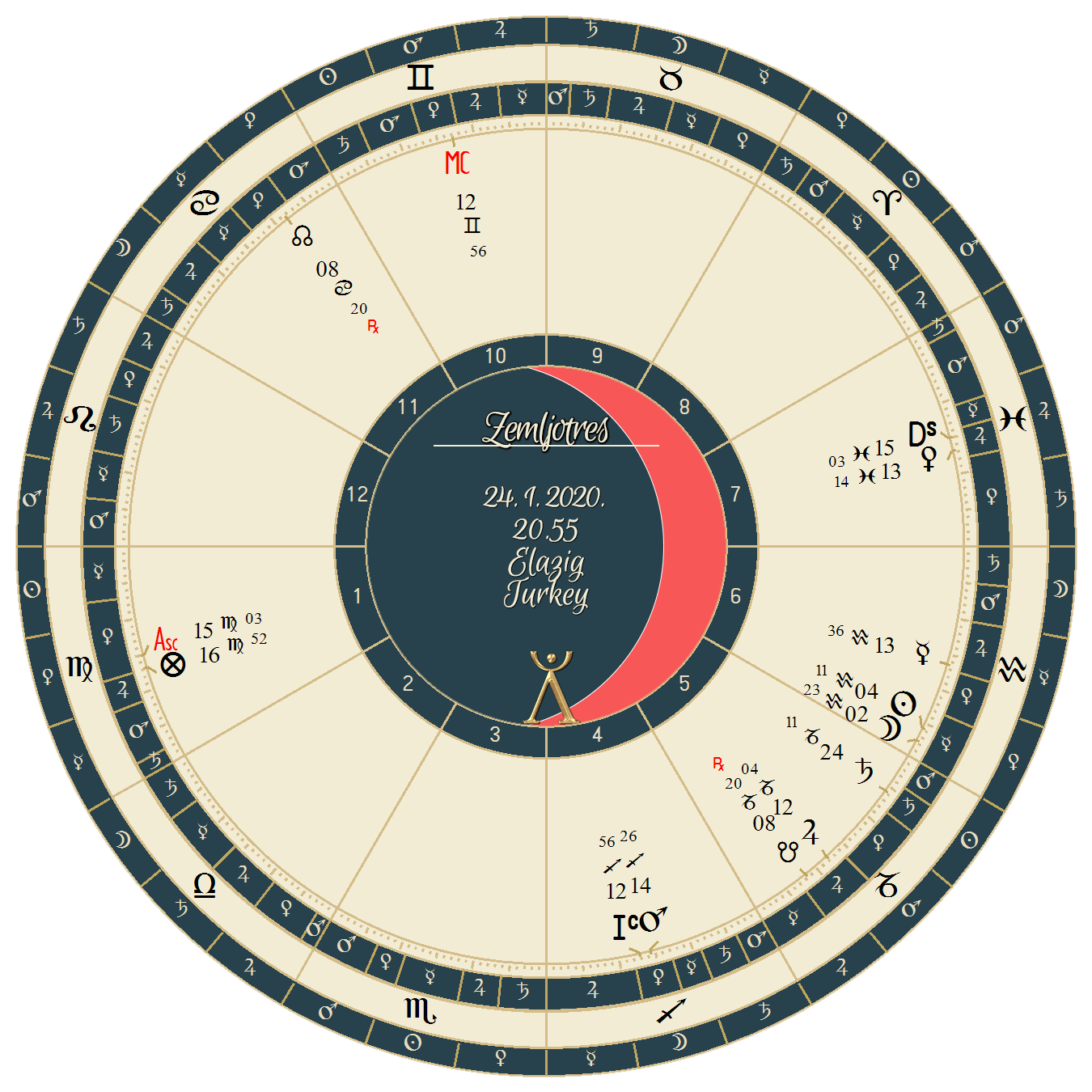 Ascendent horoskopa u Devici, na fiksnoj zvezdi Mizar. Ova zvezda prirode Marsa smeštena je u repu Velikog medveda, zloslutna je i predskazuje nesreće. Nikako ne može da nam promakne Mars koji se namestio skoro egzaktno na podzemni ugao odakle kvadratom aspektuje stepen ascendenta. Kada se nađe u ovoj poziciji, obično ukazuje na požare, rušenja zgrada i drugih objekata, rudarske nesreće i zemljotrese, što je u potpunosti opravdao.